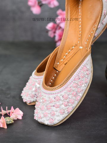 This is traditional wear juttis , Beautiful baby pink small beads with sequence. They gives pretty look to Juttis..