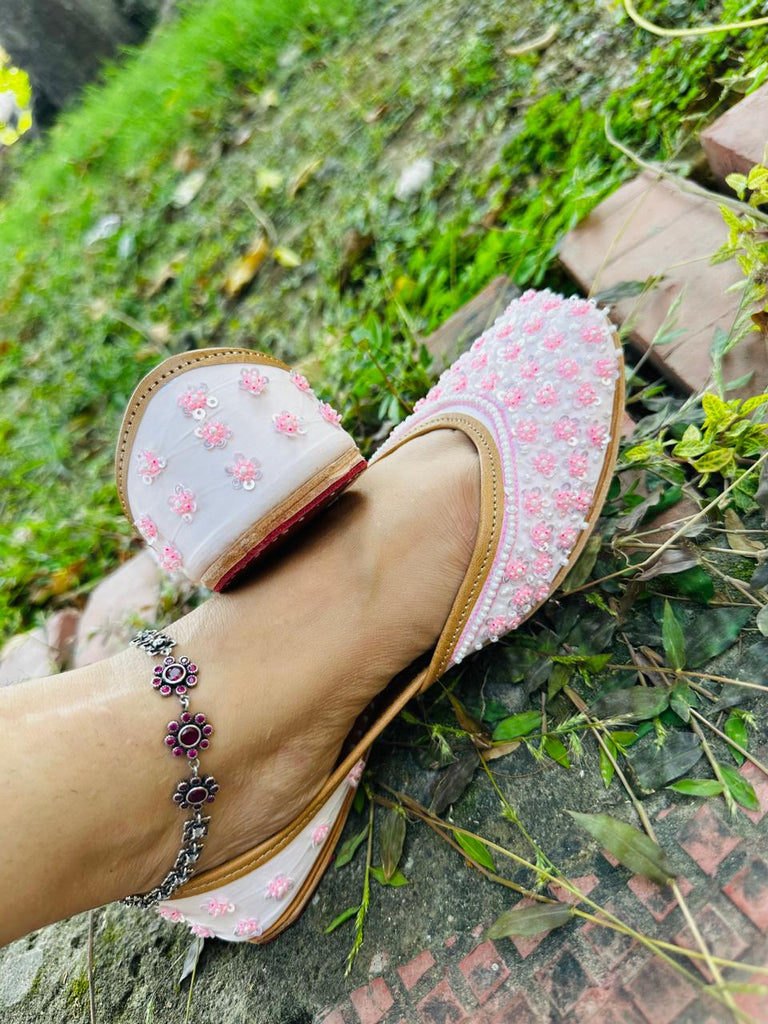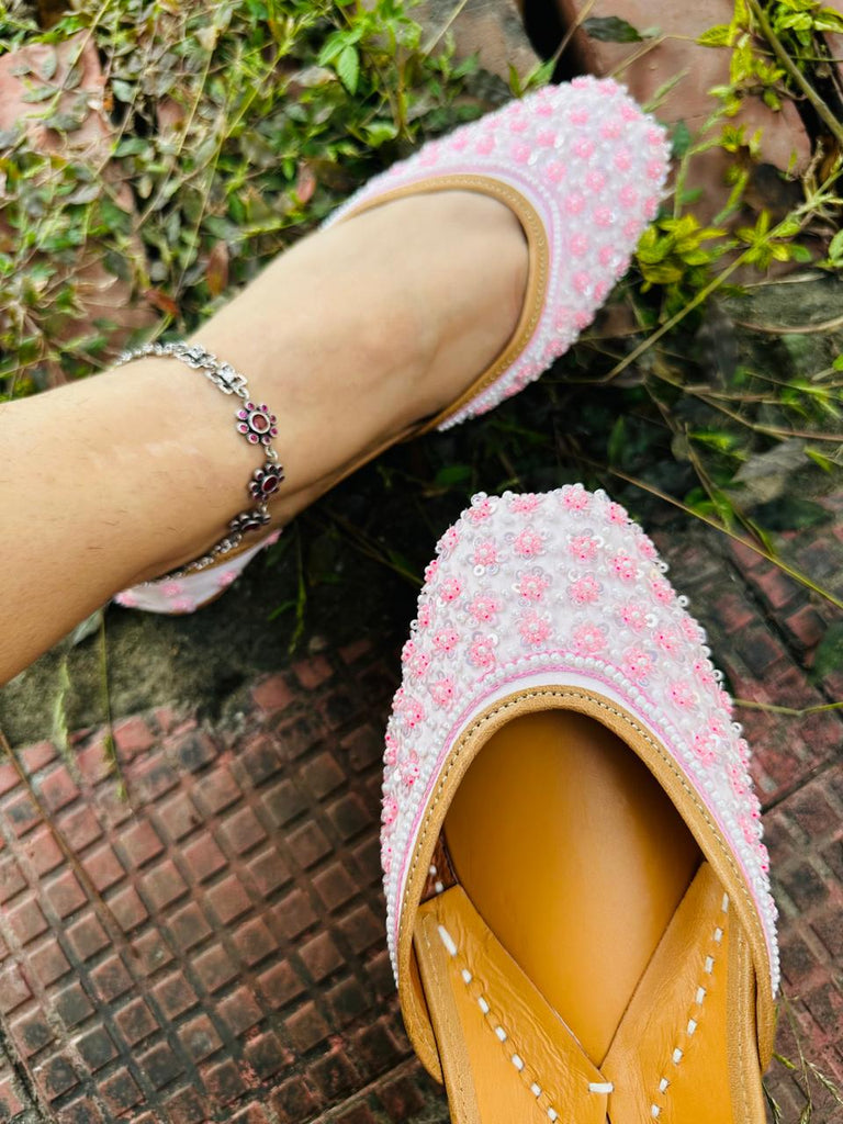 This is traditional wear juttis , Beautiful baby pink small beads with sequence. They gives pretty look to Juttis.