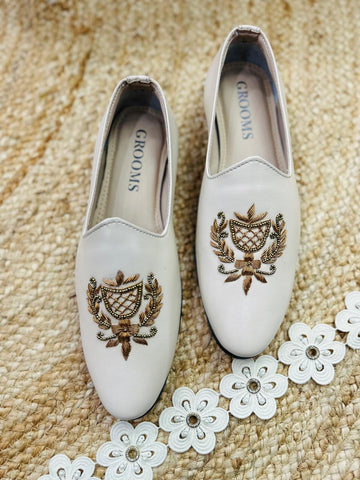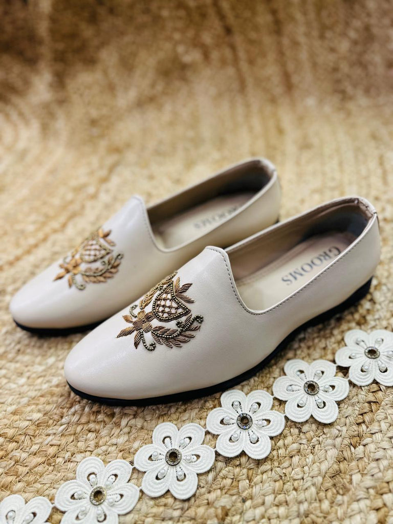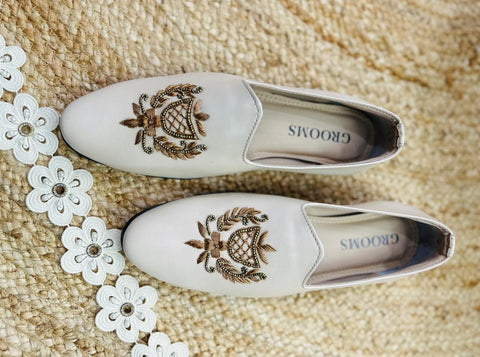 It is traditional wear loafer shoes for men collection, Gold dabka and beads work on cream beige color micro soft leather. It gives traditional look for men.