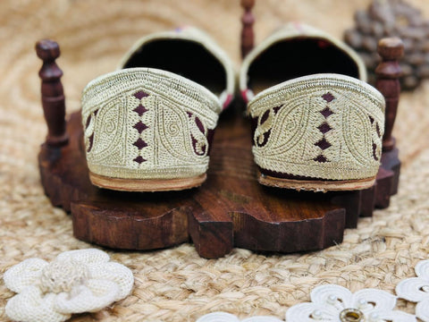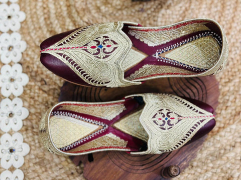 These are beautiful jutti, also known as mojaris or khussa, A traditional type of footwear widely worn across south Asia, particularly in North India and Pakistan. they are usually made of genuine leather, these feature Zardosi or TIlla embroidery - using metalluc threads (Gold or Silver) to create the ornate pattern. It has rich maroon/ burgundy bese with a "M-shaped" front upper which is a classic silgouette for festive or wedding wear.