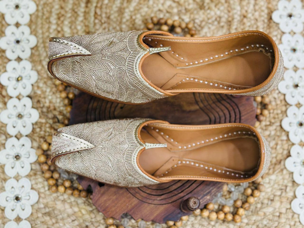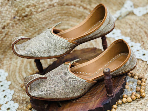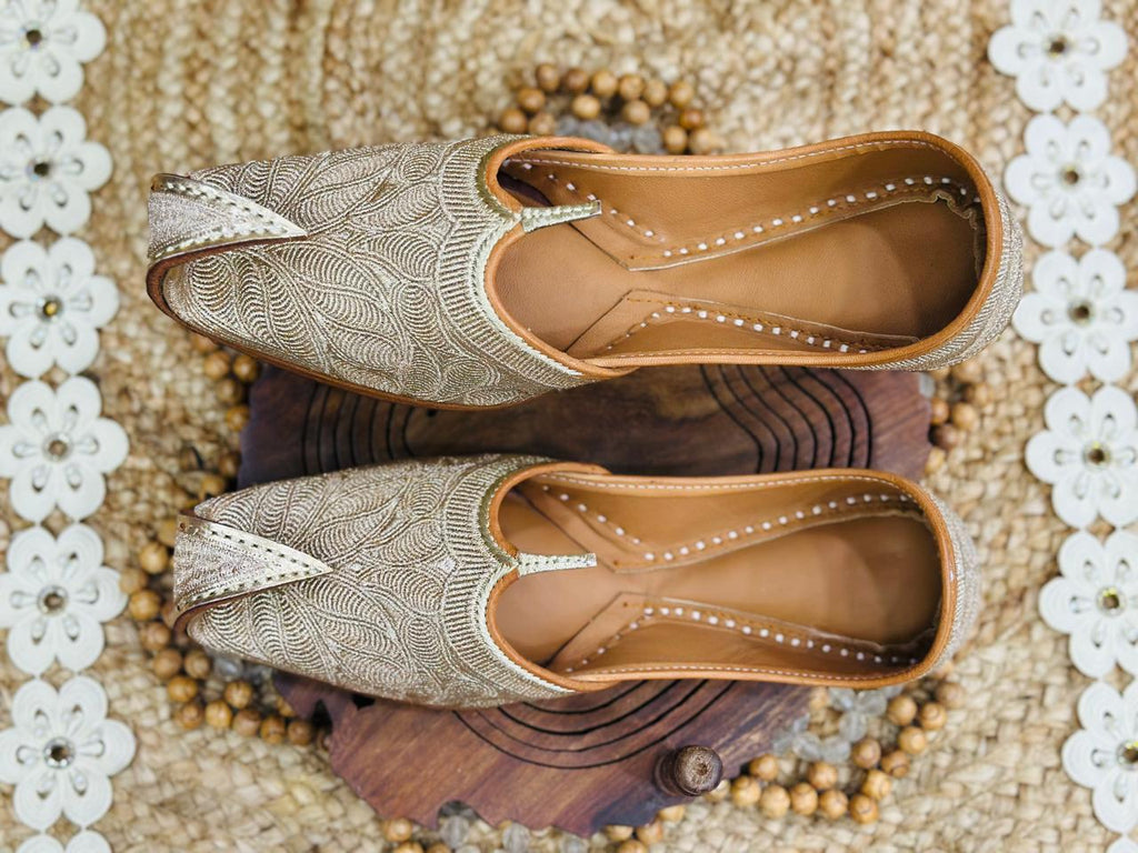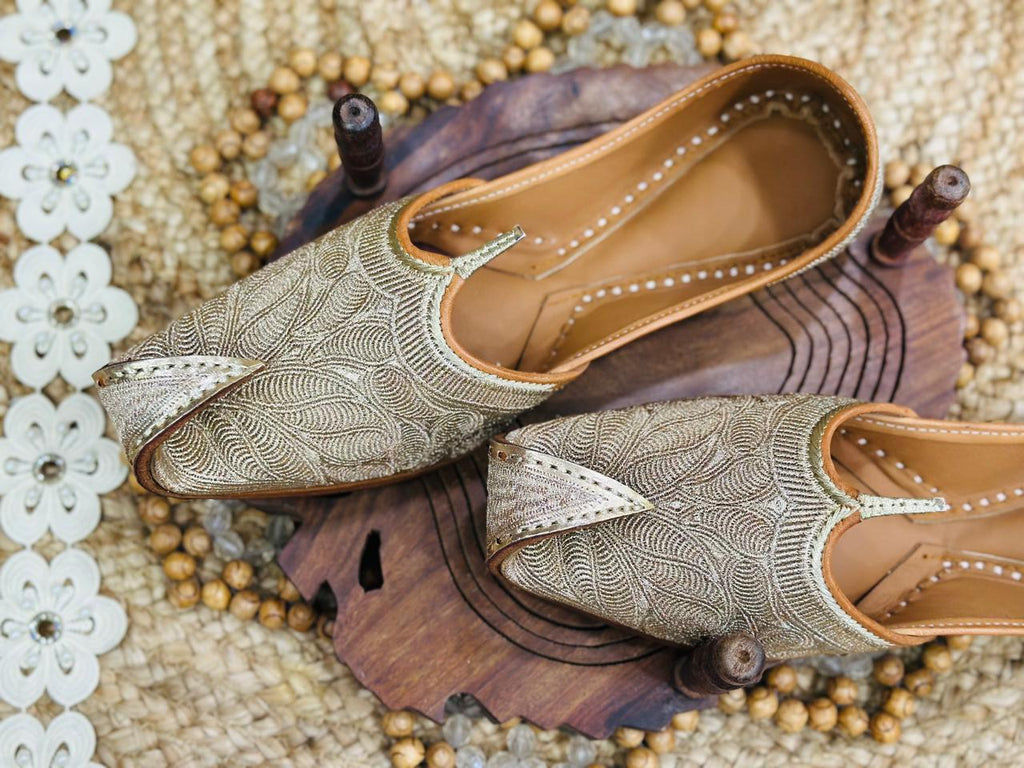 These are beautiful jutti or khussa, A type of traditional south Asian footwear popular across north Indian and Pakistan. They are highly regarded for their craftmanship and cultural heritage, The uppers feature dense zardosi or thread work in a Gold palette. The pattern appears to be a stylized floral or "paisley" leaf motif. These are curved pointed toe,