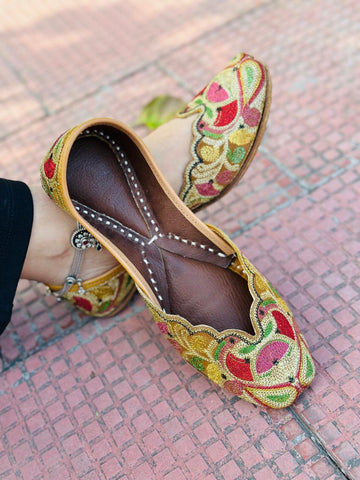 These are beautiful juttis also known as Mojaris, A traditional footwear style common in north Indian or Pakistan, particularly in the Punjab region, there are zardosi or Phulkari inspired embroidery with metallic threads and intricate patterns.
