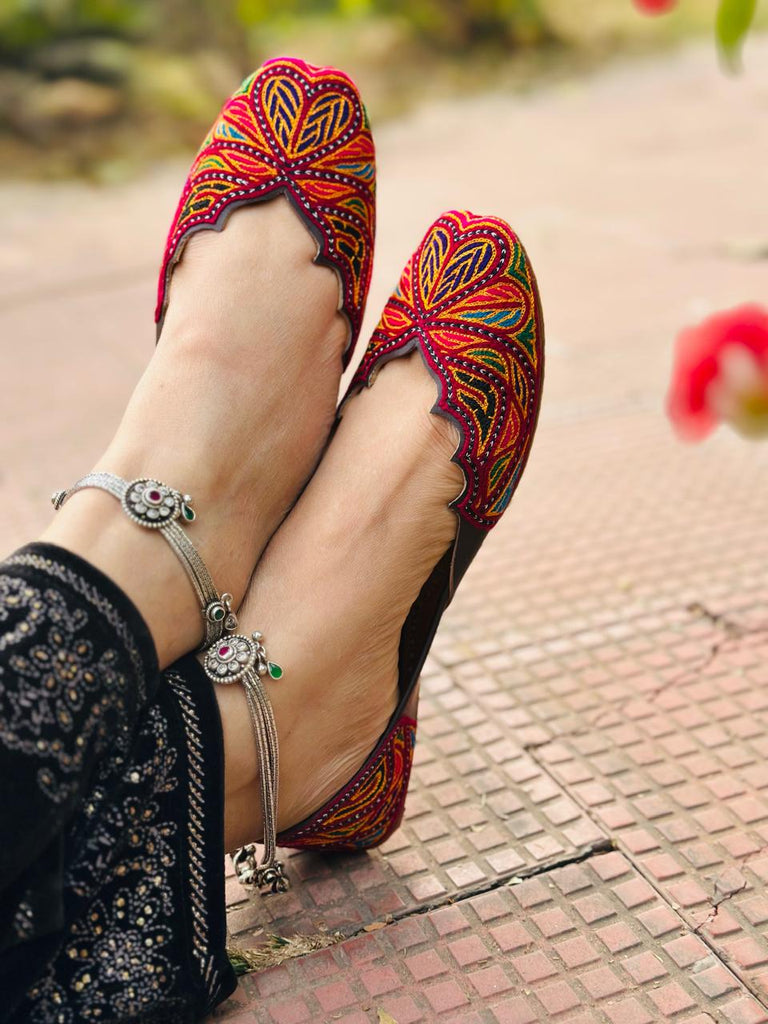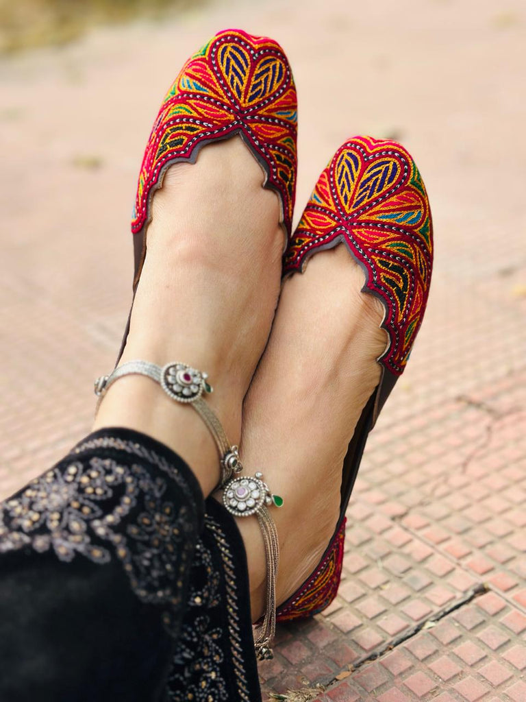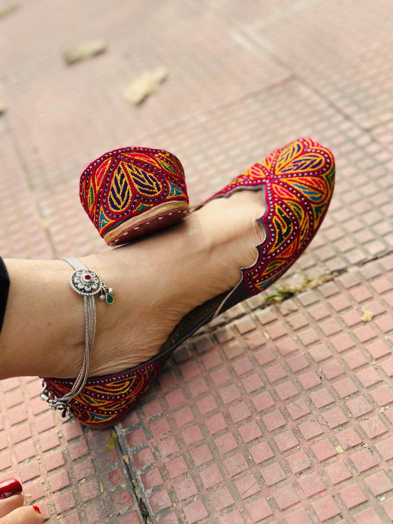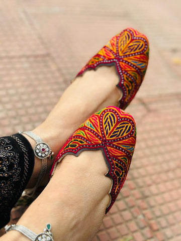 A very colorful pair, The vibrant thread work jutti with a subtle outlining of orange. It's a unique Pakistani pair to flaunt, With a little cutwork to make it extra cute.