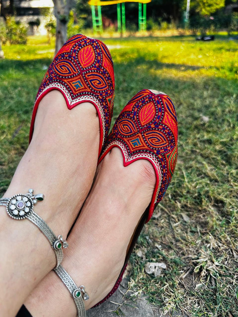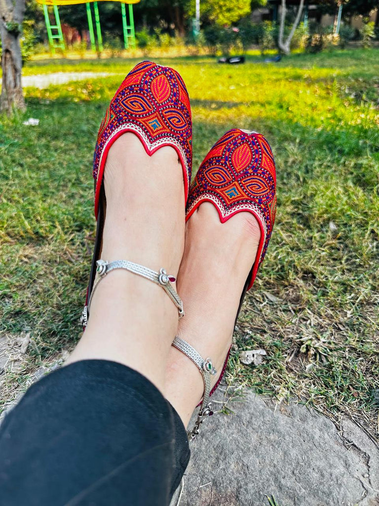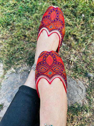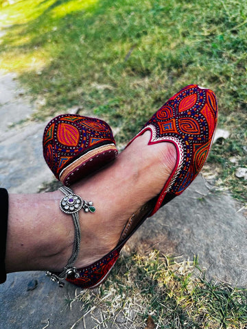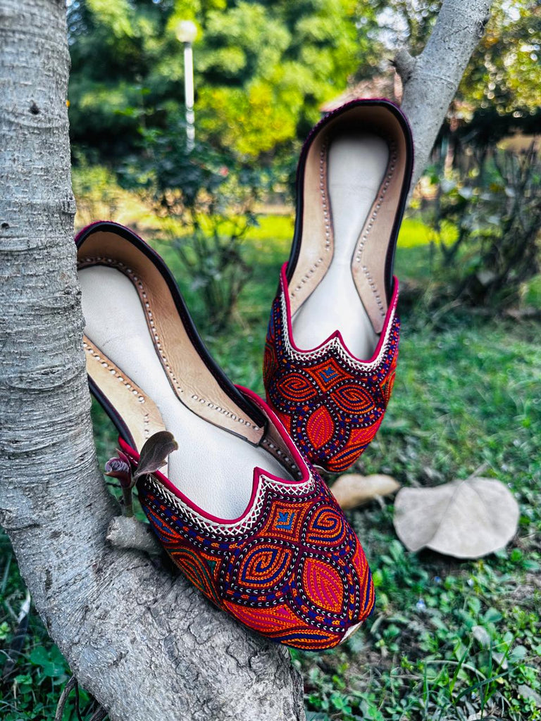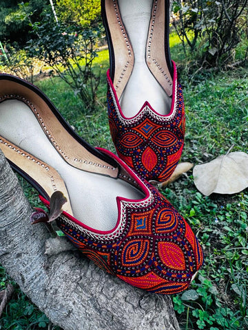 A very colourful pair, the vibrant threadwork jutti, with a subtle outlining of green. It's a unique pakistani pair to flaunt, with a little cutwork to make it extra cute..