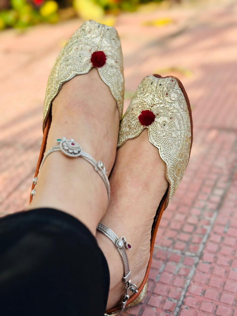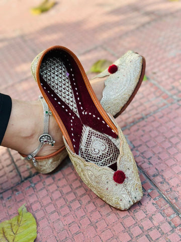ZARI WORK:-The golden metallic thread (Zari work) embroidery on the outer fabric.                VELVET LINING:- The deep maroon/burgundy interior adds comfort and a royal aesthetic.      POMPPOM:- The small red puff on the front is a traditional decorative touch.                          SCALLOPED EDGES:- The wavy border where the upper meet the front.                                     These juttis are perfect for  Ethnic wear, salwar kameez, Patiala suits, or even a simple saree.